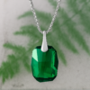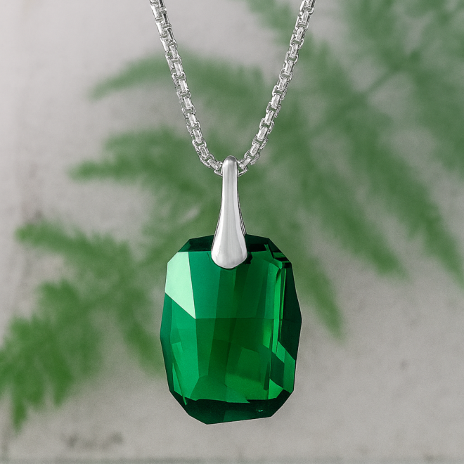 Émérion, la lumière pure. Un cristal émeraude suspendu à l’argent, pour une élégance minérale et essentielle.