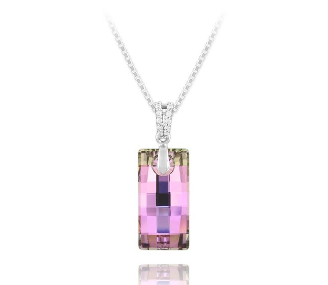 Sublimez votre allure avec ce collier en argent 925 rhodié, orné d’un cristal Vitrail Light rectangulaire (20 mm). Sa silhouette allongée révèle des reflets changeants — violet, doré, vert — qui évoquent les lumières d’une ville au crépuscule. Monté sur une chaîne fine en argent, Violette incarne l’élégance contemporaine, entre prisme et poésie. Pour une harmonie parfaite, associez-le aux boucles Violetta — leurs cristaux irisés prolongent l’éclat de la parure avec finesse.